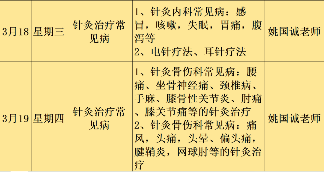 课程内容:涵盖中医基础理论、中医诊断学、经络腧穴学、推拿手法学、针灸实操等核心模块,由姚国诚、谭主任、陈永金等资深老师亲自授课