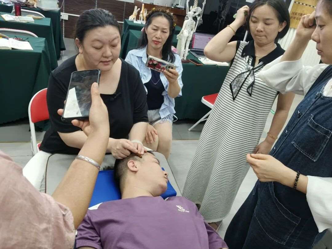 进入实操教学环节,安老师化身专业导师,全程手把手带教指导,将刮痧实操技法一步步拆解演示。从刮痧工具的选择、刮痧介质的正确使用,到刮痧的力度把控、手法规范、方向顺序,再到不同部位的刮痧技巧、补泻手法运用,每一个细节都反复示范、细致讲解。无论是基础的平刮、角刮、推刮手法,还是针对肩颈、腰背、四肢等不同部位的差异化操作,安老师都耐心细致地逐一教学,及时纠正学员们的手法偏差,手把手纠正每一个不规范动作,确保每位学员都能掌握标准、安全、有效的刮痧技法。